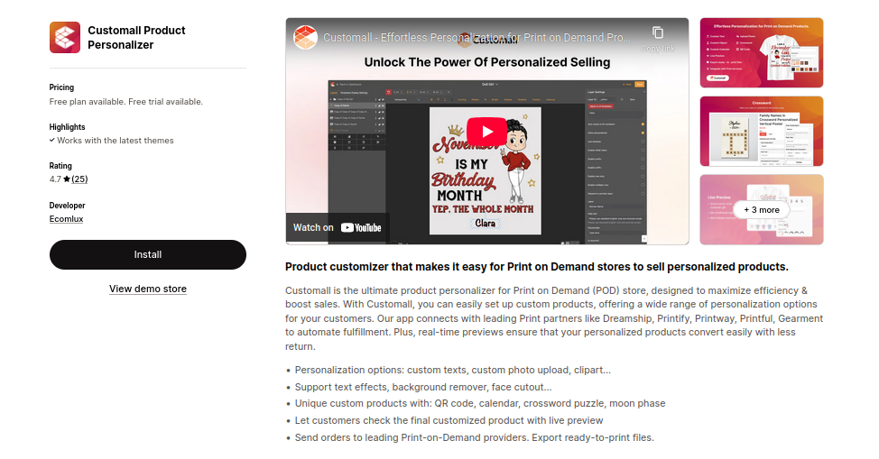 Customall takes the complexity out of running a personalized Print-on-Demand business. With its real-time previews, automated fulfillment, and advanced creative tools, it helps merchants save time while delivering a premium customization experience that converts.