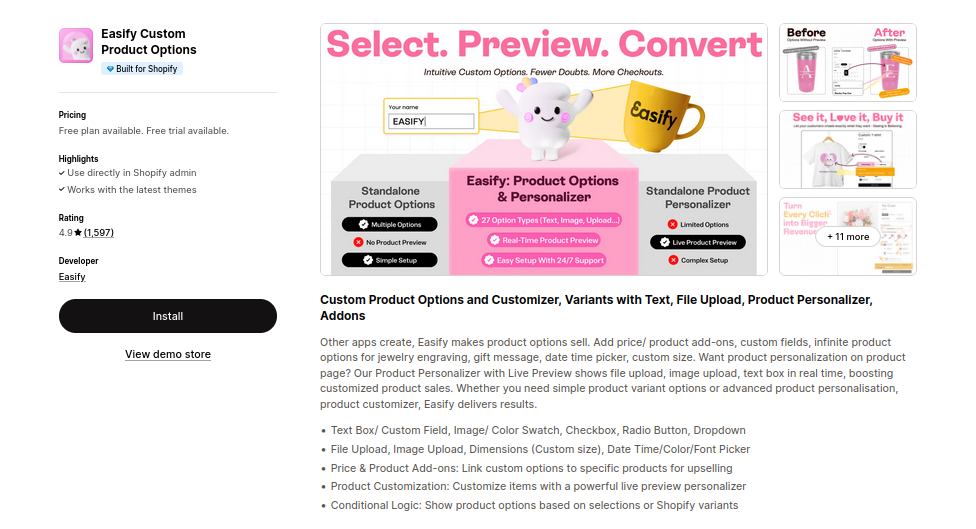 When it comes to product personalization on Shopify, Easify Product Options stands out as the most complete and conversion-focused solution. While other apps simply add options, Easify helps you sell with them — turning customization into a seamless, engaging shopping experience.
