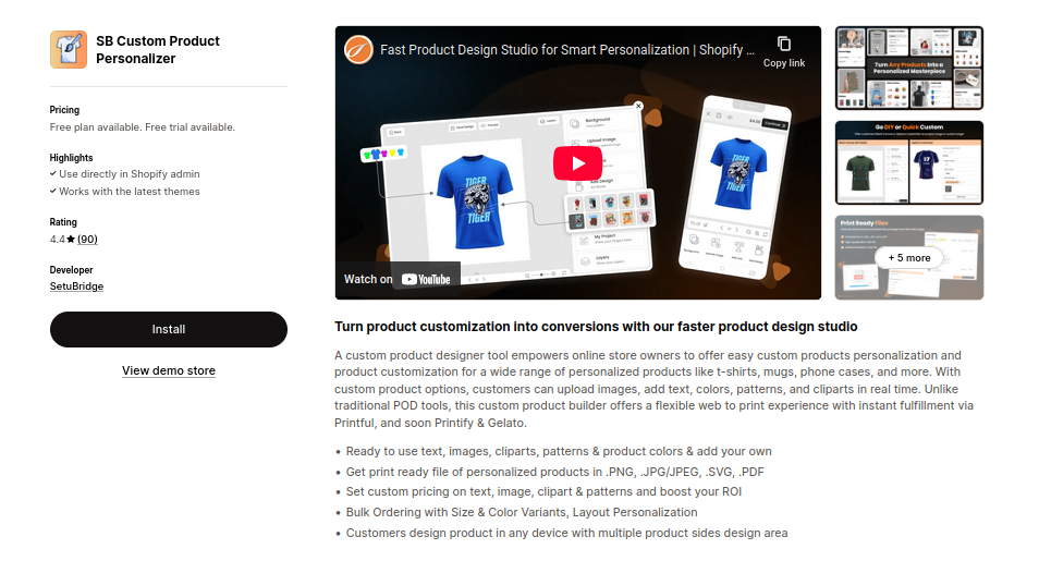 If speed and flexibility are what you’re after, SB Custom Product Personalizer delivers a next-generation design studio that turns customization into conversions. Perfect for stores offering t-shirts, mugs, phone cases, tote bags, or any print-ready product, this app gives customers a smooth, real-time design experience — no tech skills required.