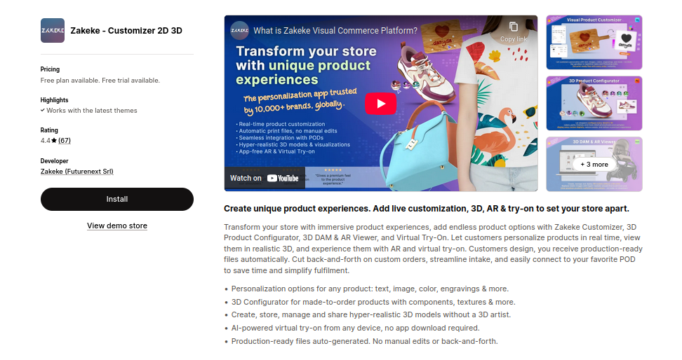 If you want to deliver a truly next-level shopping experience, Zakeke Customizer 2D/3D is the app that brings your products to life. Designed for brands that want to stand out with real-time personalization, 3D visualization, and AR try-ons, Zakeke turns static product pages into interactive showcases.